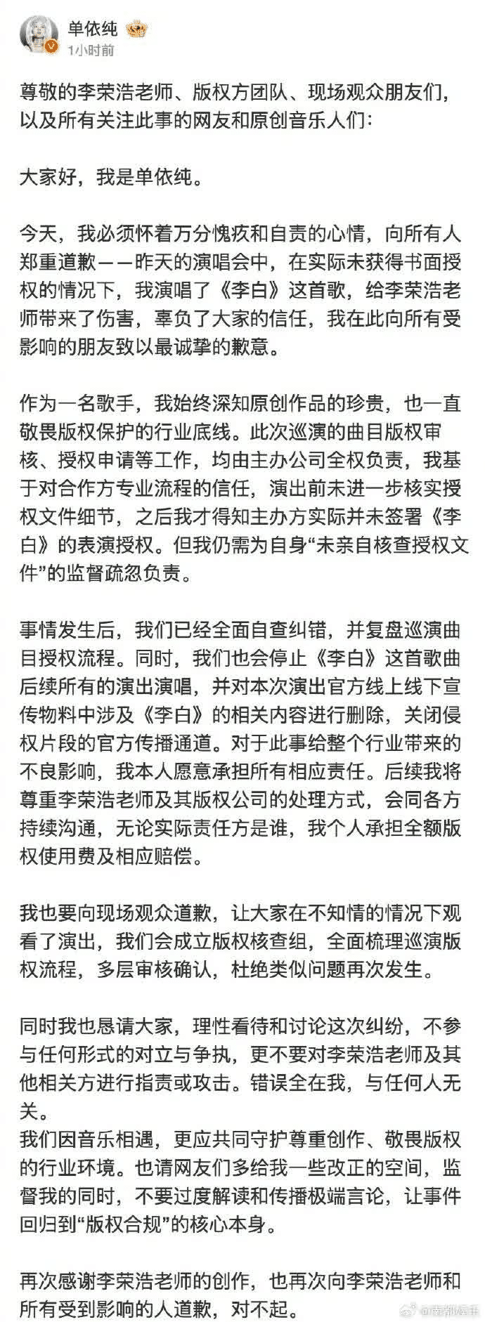 對於3月28日深圳演唱會《李白》這首歌的授權情況,是我演出前未進一步核實授權文件細節。今日我方工作人員得知主辦實際上並未簽署《李白》這首歌的表演授權。但我仍需為自身『未親自核查授權文件』的監督疏忽負責,這點無可推脫。