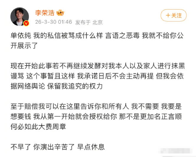 單依純道歉後,李榮浩3月30日凌晨再次發文全文: